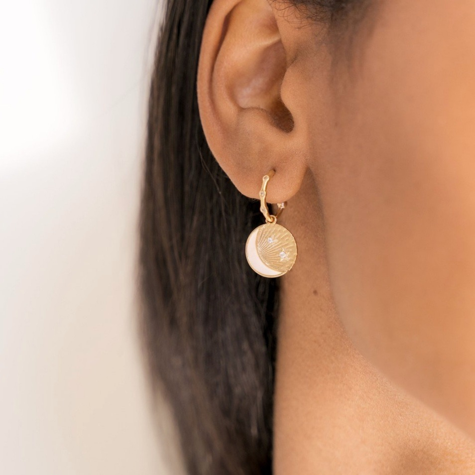 Kruhové náušnice s nebeským motívom (Celestial) s príveskom, ktorý je okrášlený polmesiacom z perlete a hviezdičkami z priezračných zirkónov.