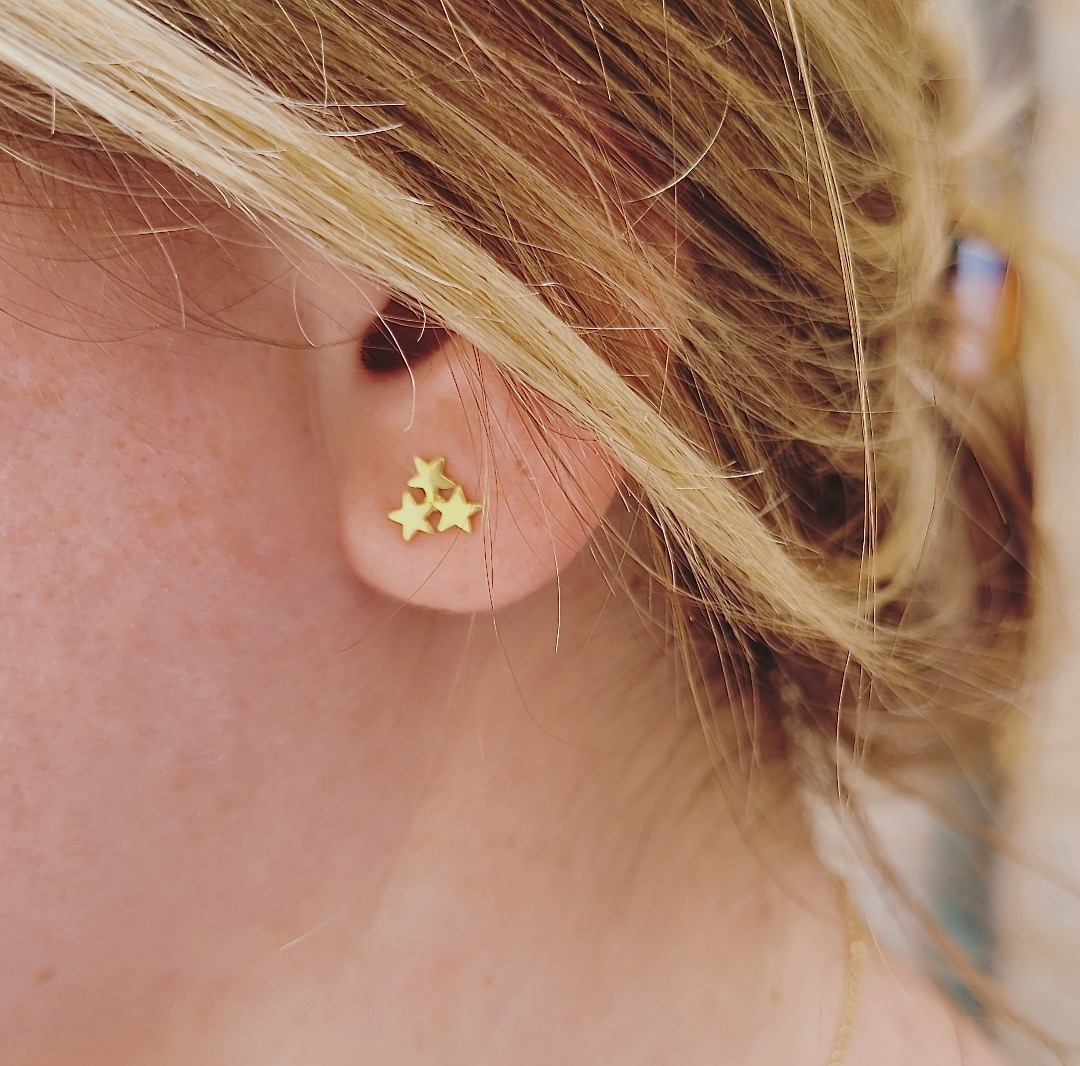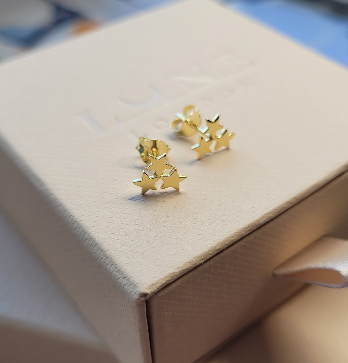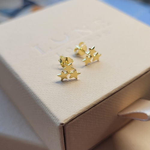 Tieto jemné náušnice s troma hviezdičkami sú vyrobené zo striebra, povrch je pozlátený 14 karátovým zlatom. Skvelý výber na všedné dni. Sú úplne dokonalé.