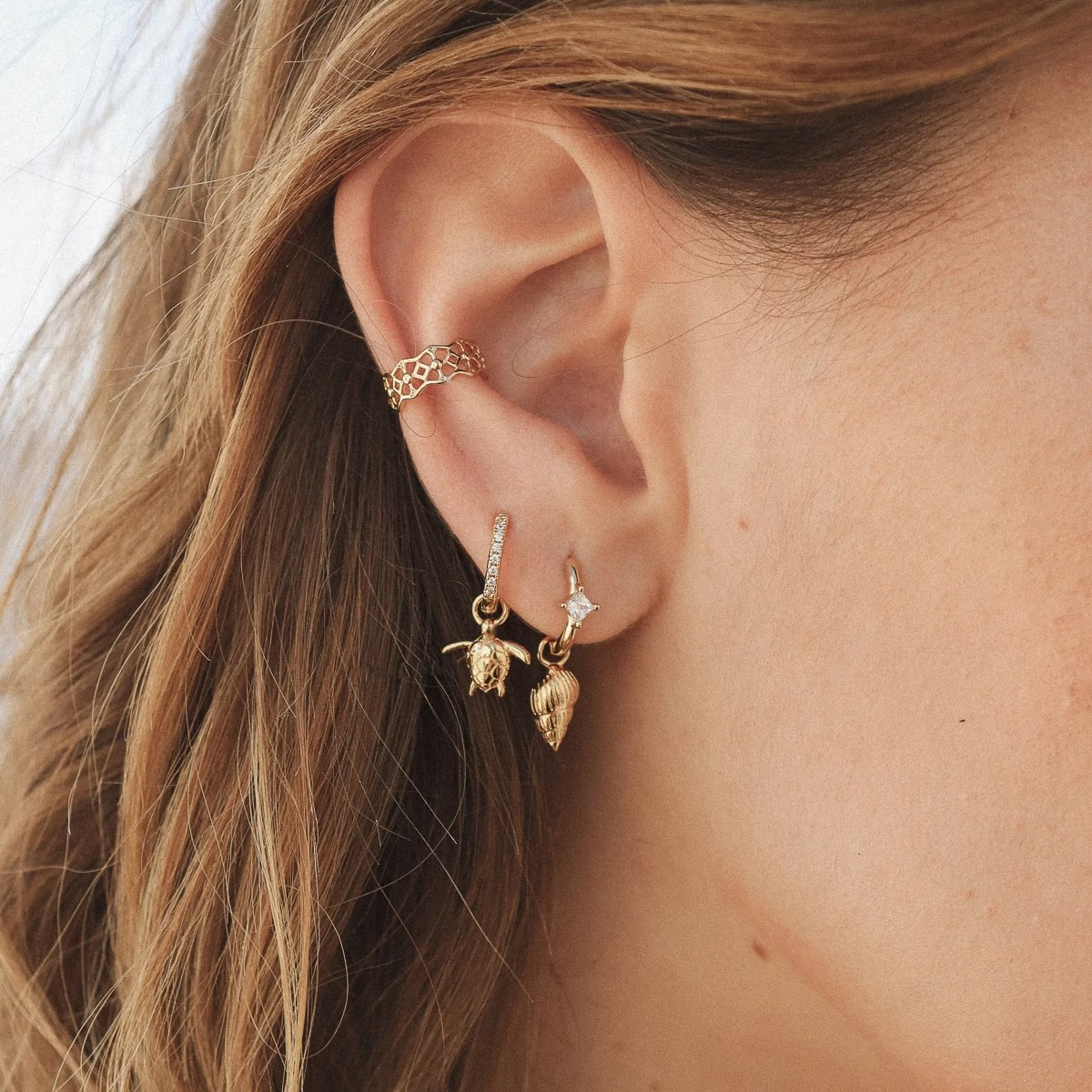 Prívesok na kruhové náušničky v tvare mušle ako dokonalé doplnenie vašej kolekcie. Pozlátený 3-mikrónovou vrstvou zlata.
